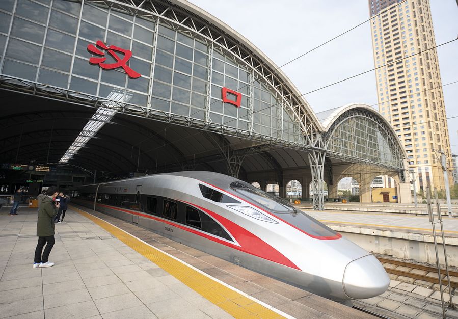 The first train of Wuhan-Shiyan high-speed railway leaves from Hankou Railway Station in Wuhan, central China's Hubei Province, Nov. 29, 2019. (Xinhua/Xiong Qi)