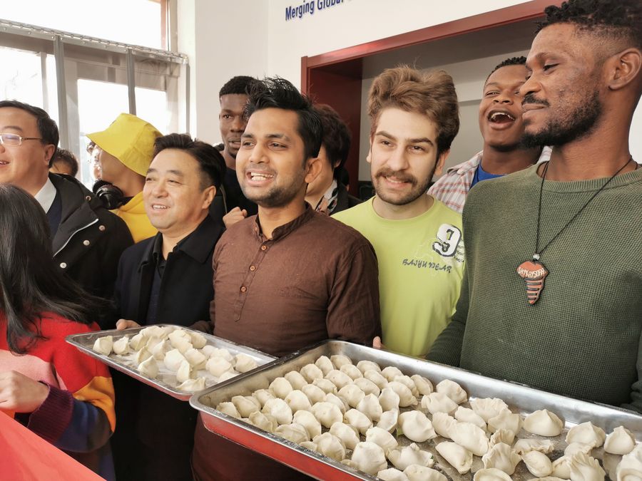 Foreign students pose for a photo after making dumplings with Chinese students in Taiyuan University of Technology in north China's Shanxi Province, Dec. 22, 2019.(Xinhua/Xie Yuan)