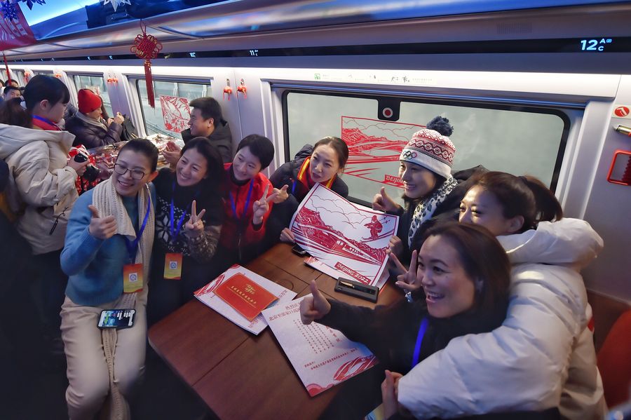 Passengers pose for photos on the G8811 high-speed train bound for Taizicheng Railway Station running on the newly opened Beijing-Zhangjiakou high-speed railway, Dec. 30, 2019. (Xinhua/Peng Ziyang)
