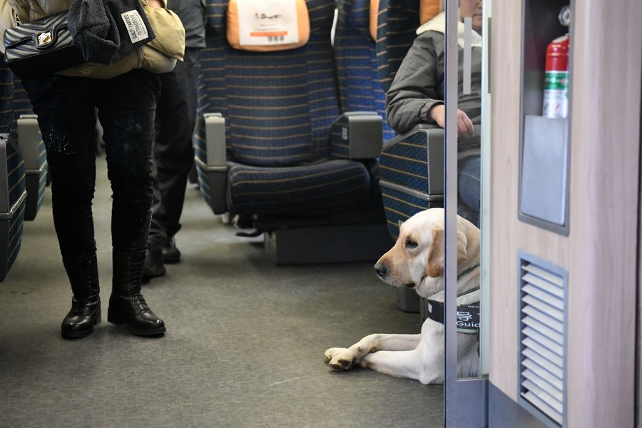 A guide dog takes a train in northwest China's Shaanxi Province, Jan. 12, 2020. (Xinhua/Li Yibo)