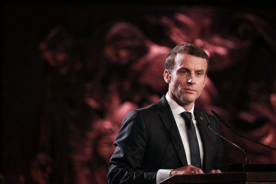 French President Emmanuel Macron speaks during the 5th World Holocaust Forum at the Yad Vashem Holocaust memorial in Jerusalem, on Jan. 23, 2020. (Yonatan Sindel/JINI via Xinhua)