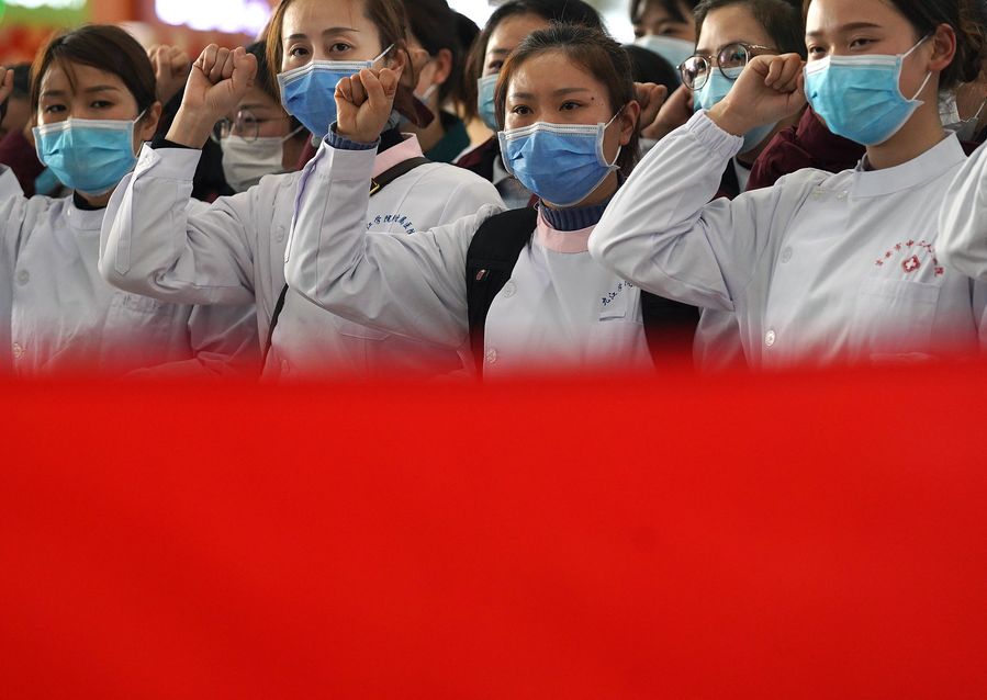 Female health workers of a 101-member medical care team swear an oath before setting off for central China's Hubei Province to combat the novel coronavirus pneumonia, in Nanchang, east China's Jiangxi Province, Feb. 4, 2020. (Xinhua/Wan Xiang)