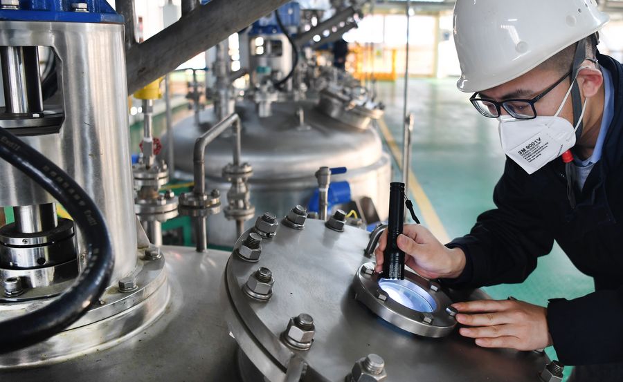 A worker inspects an electrolyte production line of a new energy material company at Huazhou District of Weinan City, northwest China's Shaanxi Province, Feb. 22, 2020. Besides working on prevention and control of the novel coronavirus pneumonia, the company has stepped up production to ensure raw material supplies to customers at home and broad amid strict prevention and control measures against the novel coronavirus. (Xinhua/Tao Ming)