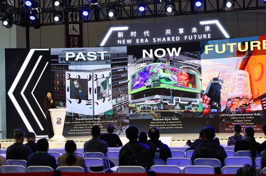 An exhibitor introduces a virtual interactive advertisement product at the Innovation Incubation Special Section during the eighth China International Import Expo (CIIE) in east China's Shanghai, Nov. 9, 2025.(Xinhua/Fang Zhe)