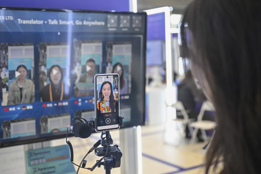 A visitor experiences a real-time AI facial translation technology at the Innovation Incubation Special Section during the eighth China International Import Expo (CIIE) in east China's Shanghai, Nov. 9, 2025. (Xinhua/Chen Haoming)