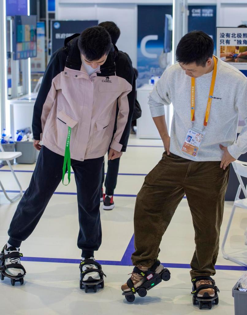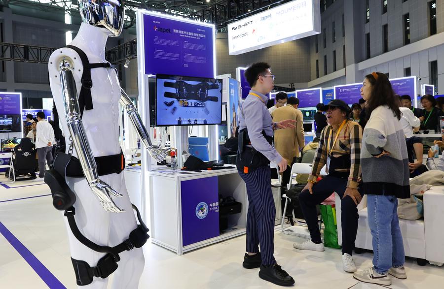A staff member (L) introduces an exoskeleton product to visitors at the Innovation Incubation Special Section during the eighth China International Import Expo (CIIE) in east China's Shanghai, Nov. 9, 2025.(Xinhua/Fang Zhe)