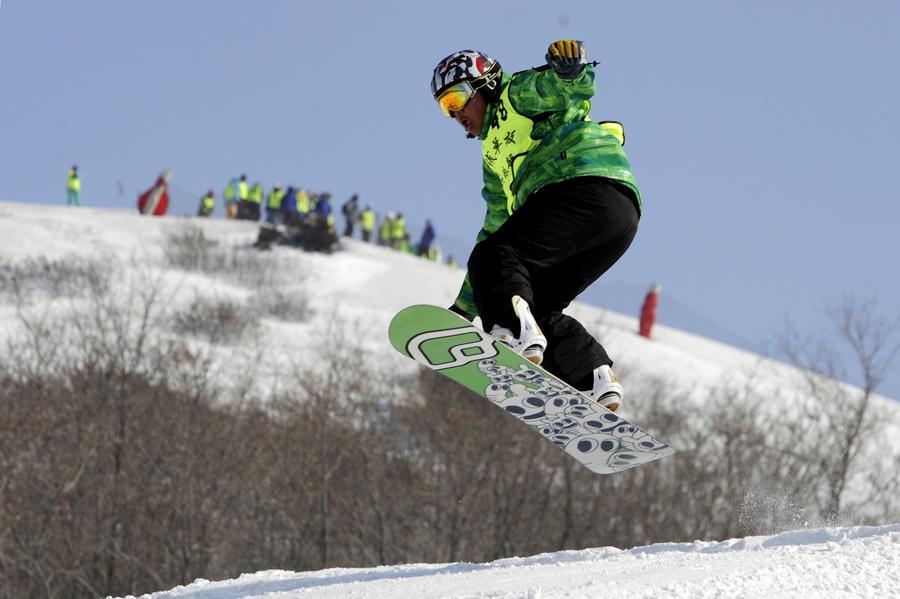 A contestant competes during a local snowboarding competition held at Guaipo ski resort in Shenyang, northeast China's Liaoning Province, Feb. 26, 2012. (Xinhua)