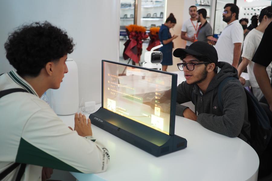 Foreign merchants experience an AI translation interactive device at the Global Digital Trade Center in Yiwu, east China's Zhejiang Province, Oct. 14, 2025. (Xinhua/Liu Ziyi)