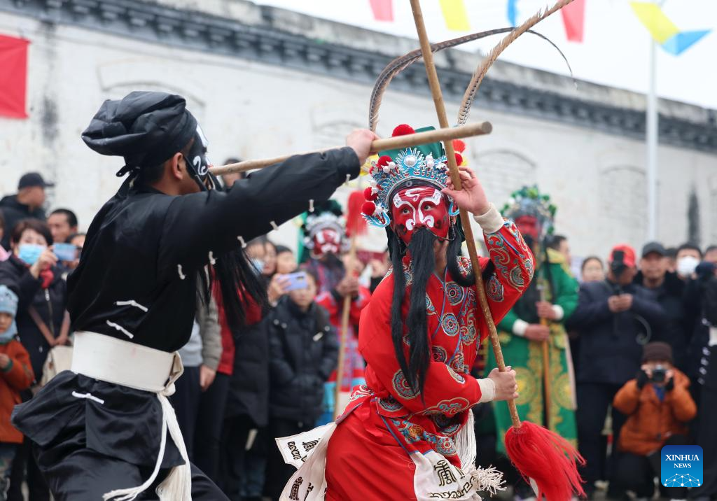 Folk artists perform during a Shehuo gala in Taolinping Village, Jingxing County, north China's Hebei Province, March 3, 2026. Across China, a variety of vibrant activities were held in celebration of the Lantern Festival, which falls on the fifteenth day of the first month of the Chinese lunar calendar, or March 3 this year. (Xinhua/Yang Shiyao)