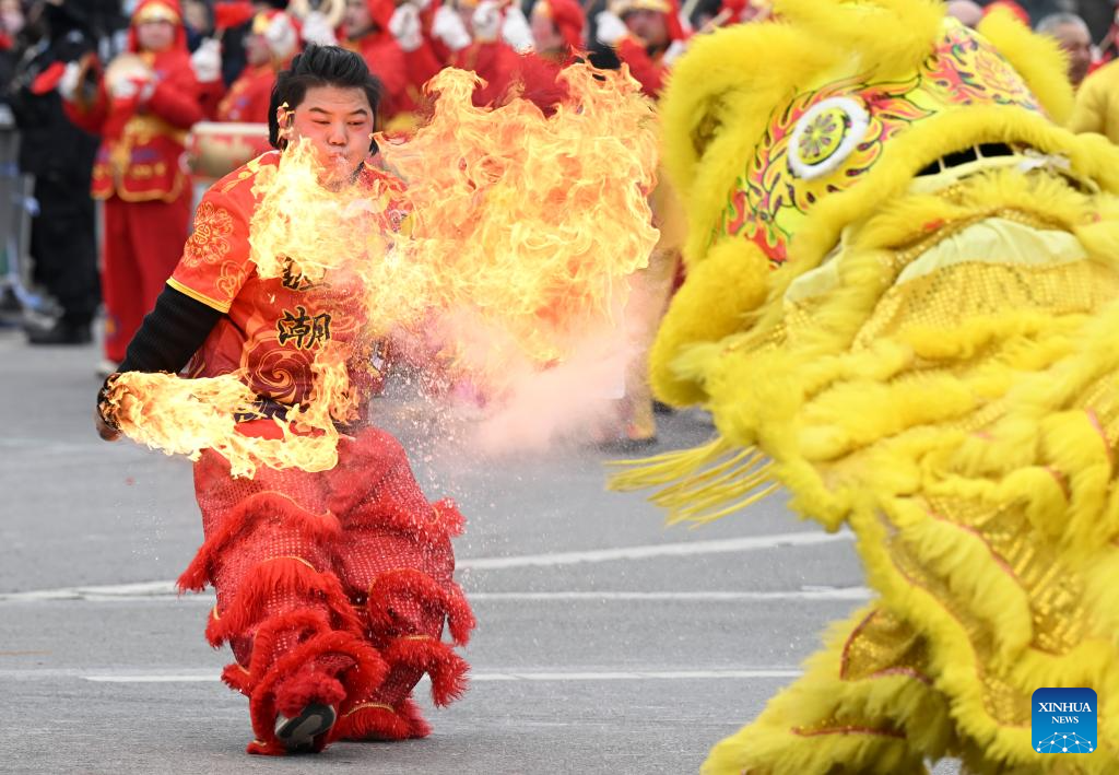 People watch a lion dance in celebration of the Lantern Festival in Jinan, east China's Shandong Province, March 3, 2026. Across China, a variety of vibrant activities were held in celebration of the Lantern Festival, which falls on the fifteenth day of the first month of the Chinese lunar calendar, or March 3 this year. (Xinhua/Xu Suhui)