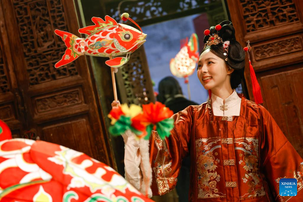 A tourist holding a fish-shaped lantern poses for photos in Zhanqi Village, Shexian County, Huangshan City of east China's Anhui Province, Feb. 14, 2026. (Photo by Shi Yalei/Xinhua)