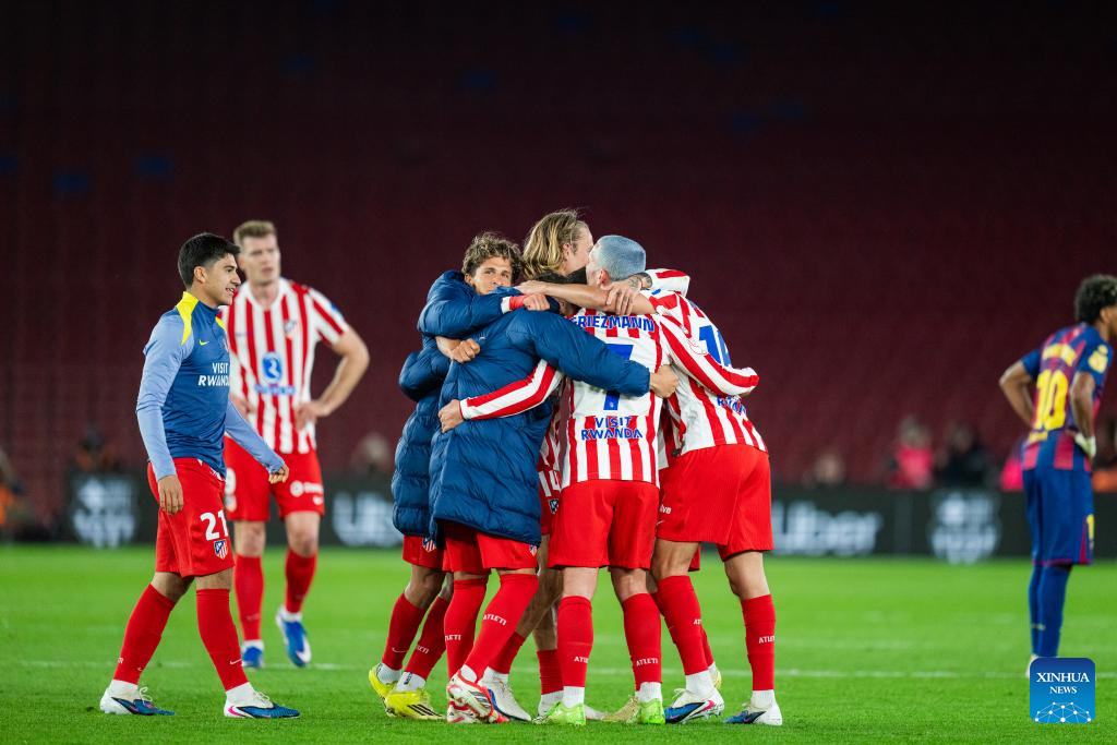 Players of Atletico de Madrid celebrate after the Copa del Rey semifinal round 2 match between FC Barcelona and Atletico de Madrid in Barcelona, Spain, March 3, 2026. (Photo by Joan Gosa/Xinhua)