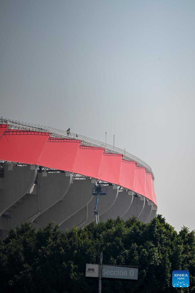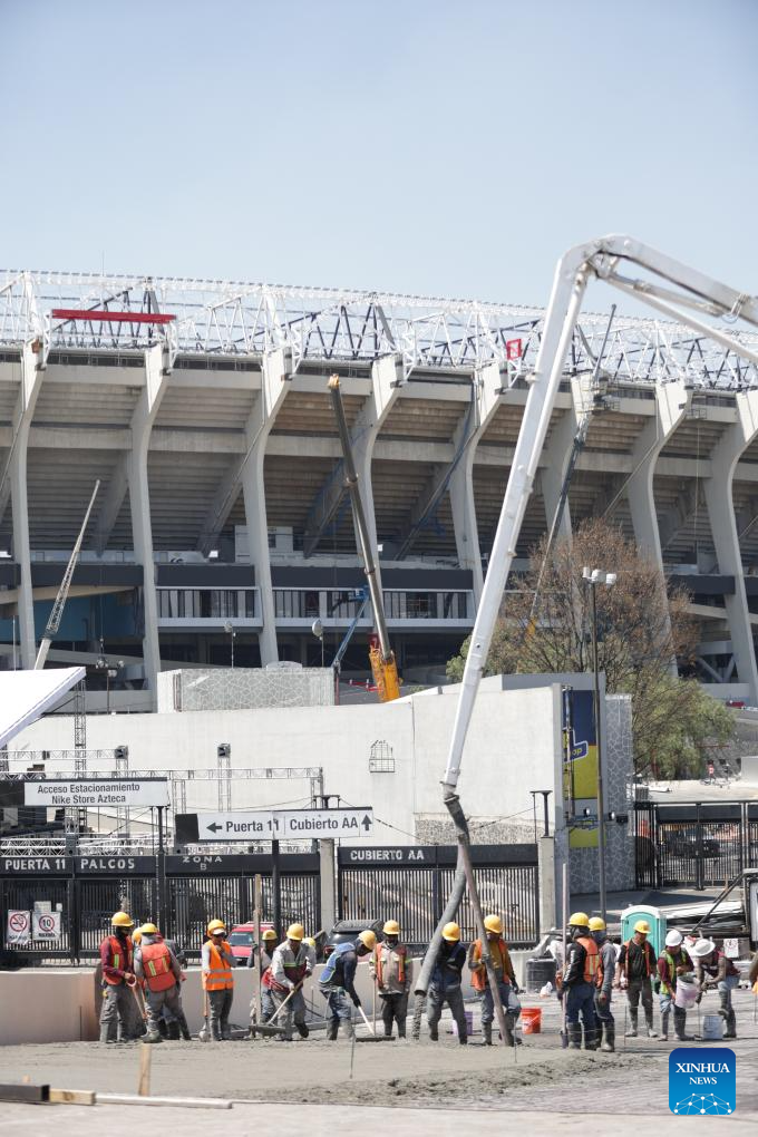 Construction workers work at the Azteca Stadium in Mexico City, Mexico, March 3, 2026. The expanded 48-team World Cup, to be co-hosted by the United States, Canada, and Mexico, will run from June 11 to July 19, 2026. Mexico City's iconic Azteca Stadium, which staged the 1970 and 1986 World Cup finals, will host the opener and four other matches in the next edition of football's showpiece tournament. (Xinhua/Li Muzi)