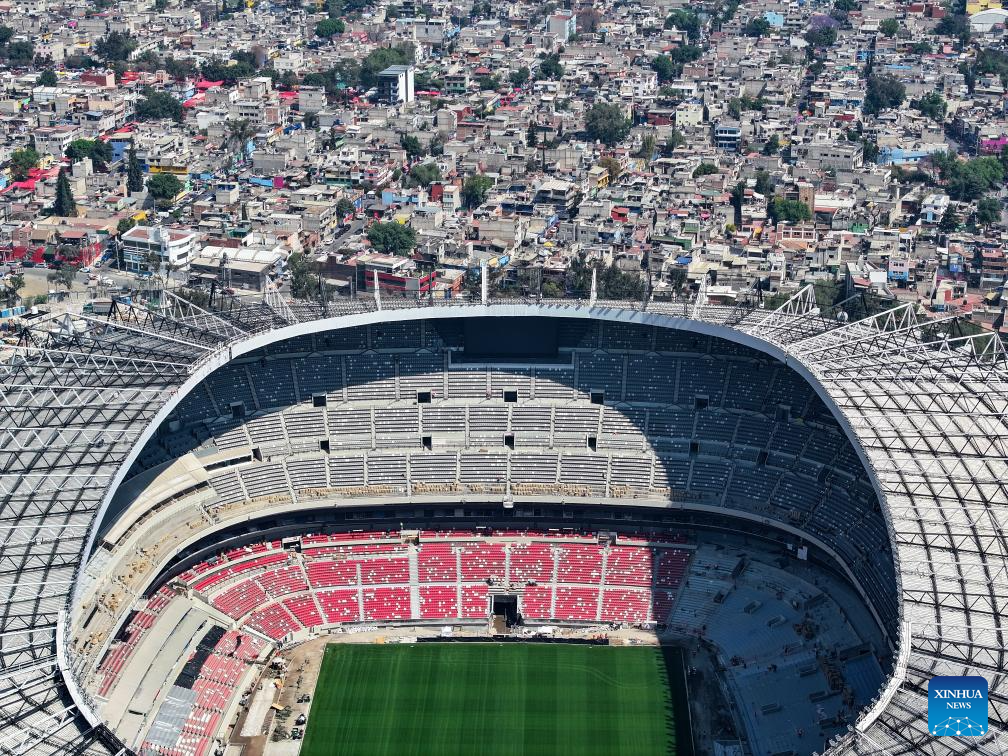 This drone photo shows the Azteca Stadium in Mexico City, Mexico, March 3, 2026. The expanded 48-team World Cup, to be co-hosted by the United States, Canada, and Mexico, will run from June 11 to July 19, 2026. Mexico City's iconic Azteca Stadium, which staged the 1970 and 1986 World Cup finals, will host the opener and four other matches in the next edition of football's showpiece tournament. (Xinhua/Li Muzi)
