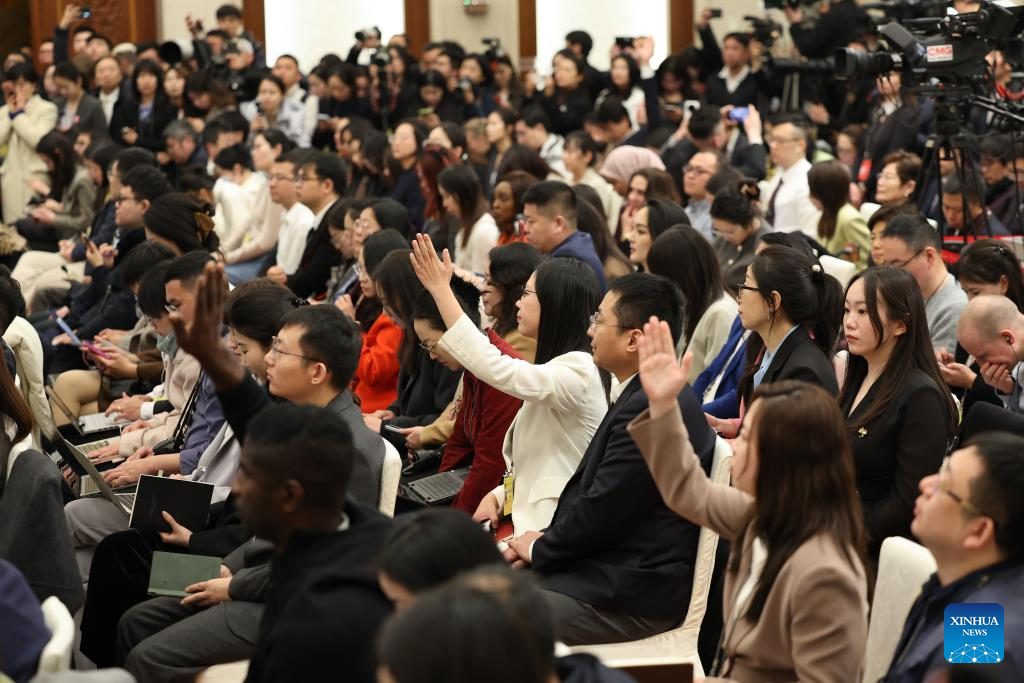 Journalists raise hands to ask questions at a press conference of the fourth session of the 14th National People's Congress (NPC) at the Great Hall of the People in Beijing, capital of China, March 4, 2026. The NPC, China's national legislature, held a press conference on Wednesday, one day ahead of the opening of its annual session. (Xinhua/Li Xin)