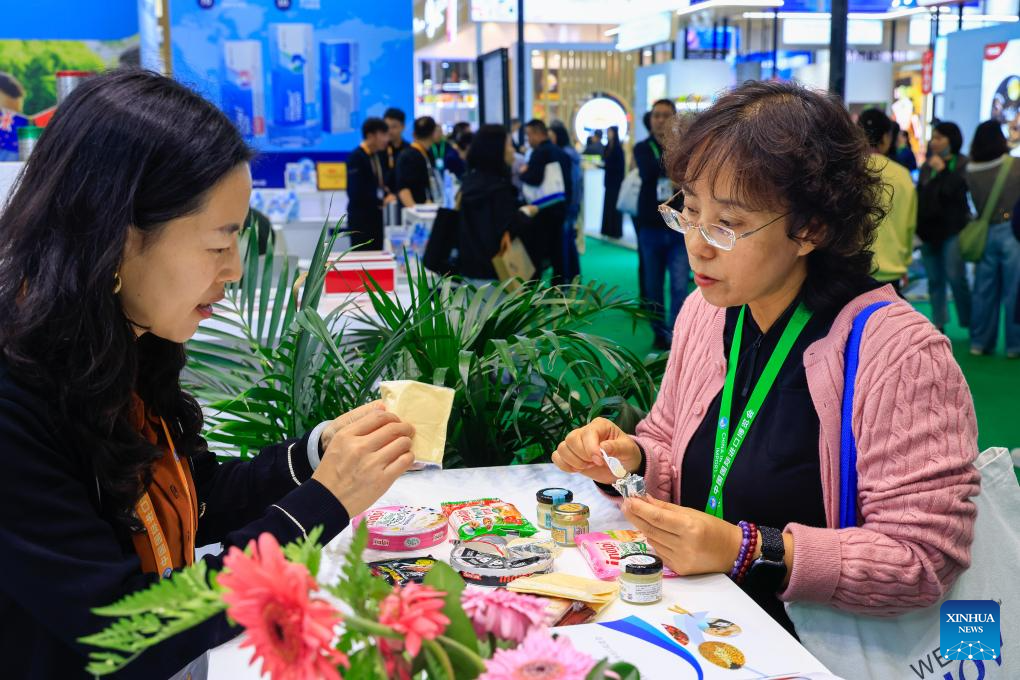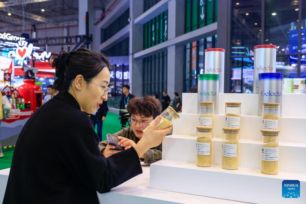 A woman visits the booth of Italgel, a leading producer of gelatin and hydrolyzed collagen, at the Food and Agricultural Products exhibition area during the eighth China International Import Expo (CIIE) in east China's Shanghai, on Nov. 8, 2025. Agriculture is an industrial pillar of Italy, a country which uses 56 percent of its land for agriculture. The country is home to about 1.6 million farm-based businesses, many of which make agri-food products prized worldwide for their quality and craftsmanship. Italian agri-food companies see the eighth China International Import Expo (CIIE) as a key gateway to the world's second-largest consumer market, where they seek greater space for sales and partnerships. (Xinhua/Liu Jiaqi)