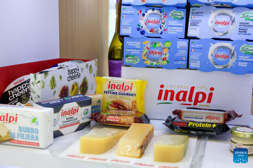 This photo shows products displayed at the booth of Inalpi, an Italian dairy company, at the Food and Agricultural Products exhibition area during the eighth China International Import Expo (CIIE) in east China's Shanghai, on Nov. 9, 2025. Agriculture is an industrial pillar of Italy, a country which uses 56 percent of its land for agriculture. The country is home to about 1.6 million farm-based businesses, many of which make agri-food products prized worldwide for their quality and craftsmanship. Italian agri-food companies see the eighth China International Import Expo (CIIE) as a key gateway to the world's second-largest consumer market, where they seek greater space for sales and partnerships. (Xinhua/Liu Jiaqi)