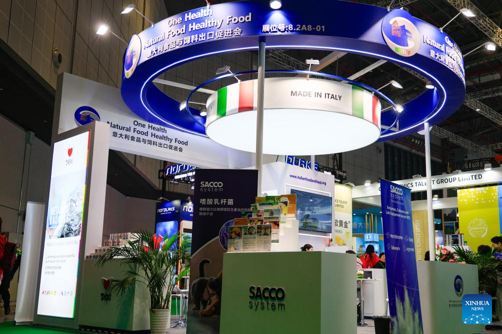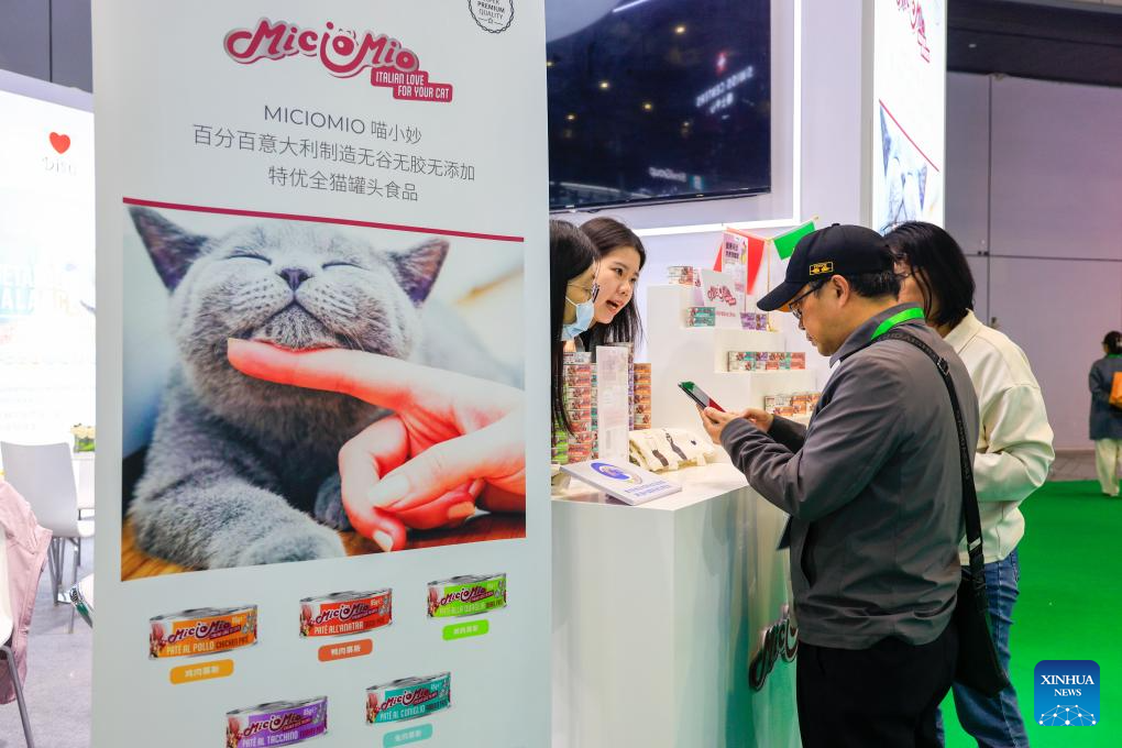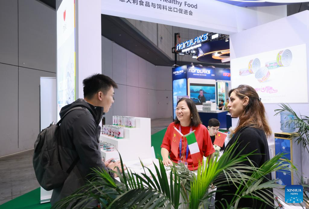People visit the booth of an Italian pet food firm at the Food and Agricultural Products exhibition area during the eighth China International Import Expo (CIIE) in east China's Shanghai, on Nov. 9, 2025. Agriculture is an industrial pillar of Italy, a country which uses 56 percent of its land for agriculture. The country is home to about 1.6 million farm-based businesses, many of which make agri-food products prized worldwide for their quality and craftsmanship. Italian agri-food companies see the eighth China International Import Expo (CIIE) as a key gateway to the world's second-largest consumer market, where they seek greater space for sales and partnerships. (Xinhua/Liu Jiaqi)