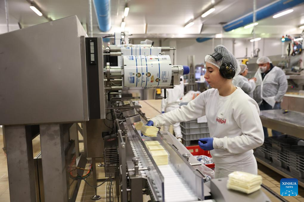 A staff member packs products at the headquarters of Inalpi, an Italian dairy company, in Moretta, Italy, Oct. 30. 2025. Agriculture is an industrial pillar of Italy, a country which uses 56 percent of its land for agriculture. The country is home to about 1.6 million farm-based businesses, many of which make agri-food products prized worldwide for their quality and craftsmanship. Italian agri-food companies see the eighth China International Import Expo (CIIE) as a key gateway to the world's second-largest consumer market, where they seek greater space for sales and partnerships. (Xinhua/Li Jing)