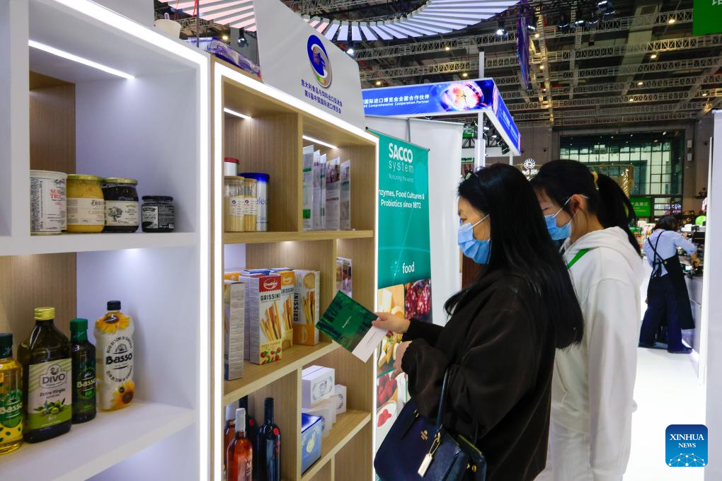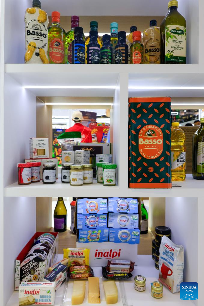 Products are pictured at the booth of Italian Food and Feed Export Promotion Association at the Food and Agricultural Products exhibition area during the eighth China International Import Expo (CIIE) in east China's Shanghai, on Nov. 9, 2025. Agriculture is an industrial pillar of Italy, a country which uses 56 percent of its land for agriculture. The country is home to about 1.6 million farm-based businesses, many of which make agri-food products prized worldwide for their quality and craftsmanship. Italian agri-food companies see the eighth China International Import Expo (CIIE) as a key gateway to the world's second-largest consumer market, where they seek greater space for sales and partnerships. (Xinhua/Liu Jiaqi)