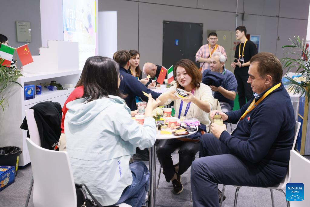 A visitor (R) tastes cheese at the booth of Inalpi, an Italian dairy company, at the Food and Agricultural Products exhibition area during the eighth China International Import Expo (CIIE) in east China's Shanghai, on Nov. 9, 2025. Agriculture is an industrial pillar of Italy, a country which uses 56 percent of its land for agriculture. The country is home to about 1.6 million farm-based businesses, many of which make agri-food products prized worldwide for their quality and craftsmanship. Italian agri-food companies see the eighth China International Import Expo (CIIE) as a key gateway to the world's second-largest consumer market, where they seek greater space for sales and partnerships. (Xinhua/Liu Jiaqi)