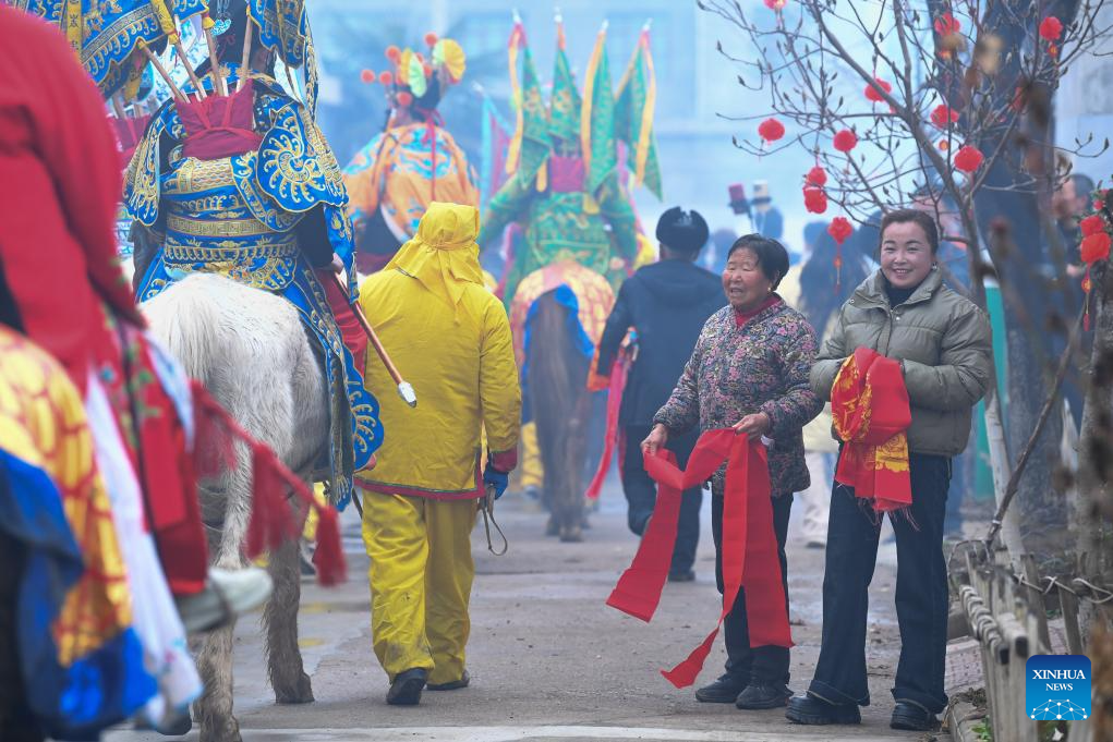 Villagers greet a team of a Shehuo parade in Huanghuayu Village in Longxian County of Baoji City, northwest China's Shaanxi Province, March 2, 2026. (Xinhua/Zou Jingyi)