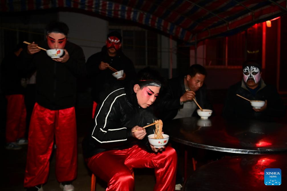 Members of a Shehuo parade team have breakfast in Huanghuayu Village in Longxian County of Baoji City, northwest China's Shaanxi Province, in the early morning of March 2, 2026. (Xinhua/Zou Jingyi)