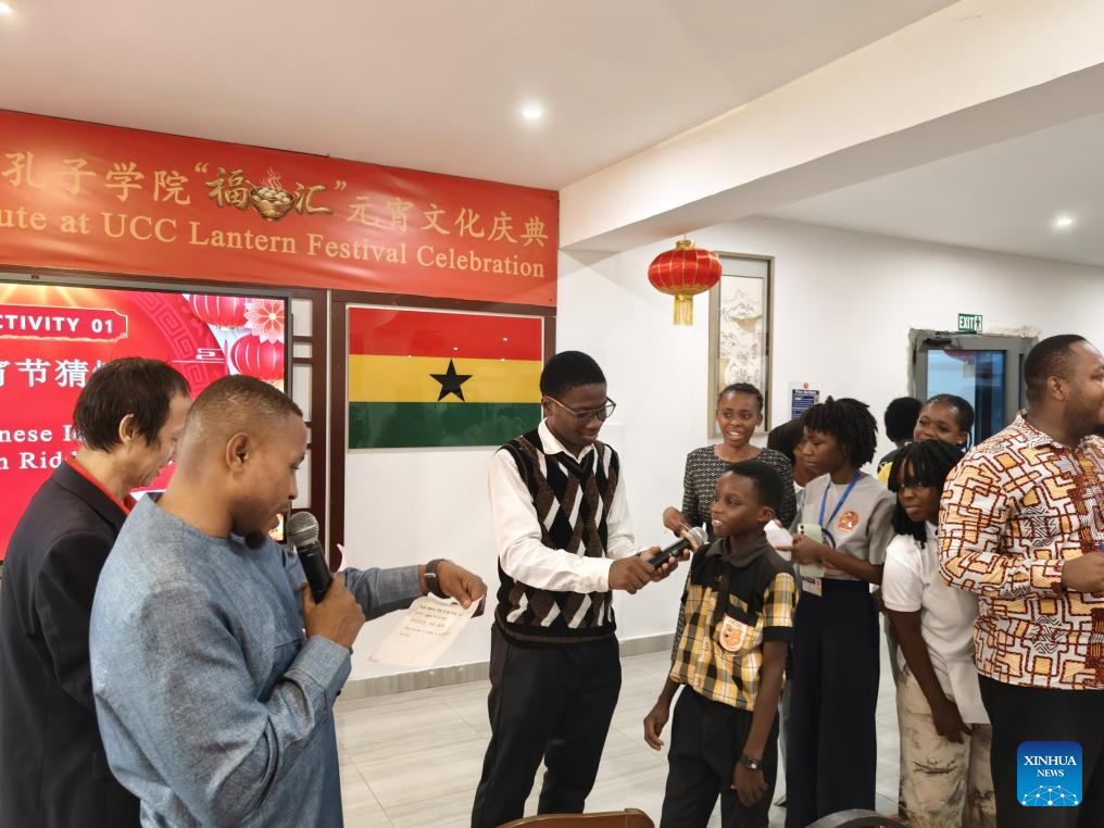 Students guess lantern riddles during a Lantern Festival celebration event at the University of Cape Coast in Cape Coast, capital of Ghana's Central Region, March 3, 2026. The event was held jointly by the Confucius Institute and the Luban Workshop at the University of Cape Coast on Tuesday, attracting students to participate in activities such as guessing lantern riddles, writing blessing characters, making lanterns and tasting Yuanxiao, Chinese sweet glutinous rice dumplings for celebrating the Lantern Festival. (The Confucius Institute at the University of Cape Coast/Handout via Xinhua)
