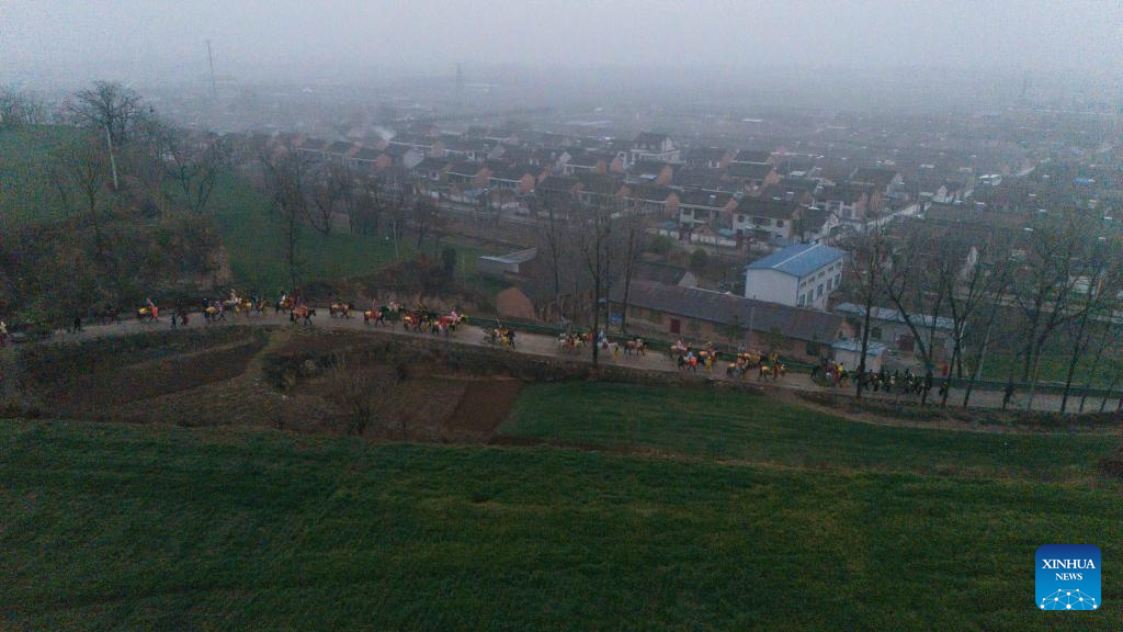 An aerial drone photo shows performers attending a Shehuo parade in Huanghuayu Village in Longxian County of Baoji City, northwest China's Shaanxi Province, March 2, 2026. (Xinhua/Zou Jingyi)