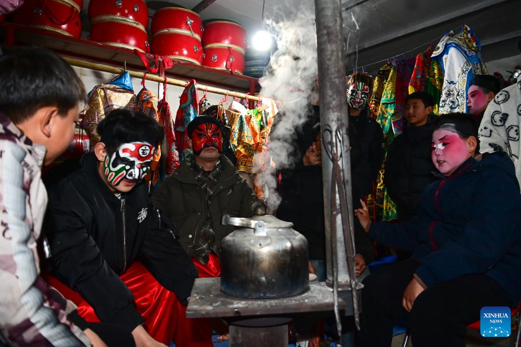 Members of a Shehuo parade team chat in Huanghuayu Village in Longxian County of Baoji City, northwest China's Shaanxi Province, March 2, 2026. (Xinhua/Zou Jingyi)