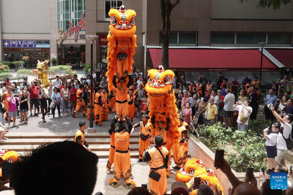 People perform lion dance in celebration of the Lantern Festival in Singapore, March 3, 2026. (Photo by Then Chih Wey/Xinhua)