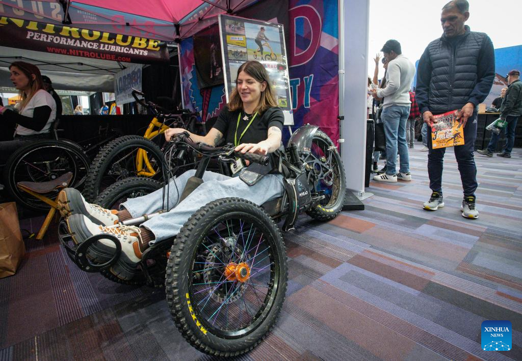 A woman sits in an electric-assist mountain tricycle during the 2026 BC Bike Show in Vancouver, British Columbia, Canada, on Feb. 28, 2026. The two-day bicycle consumer show showcased the latest products from around 60 exhibitors. (Photo by Liang Sen/ Xinhua)