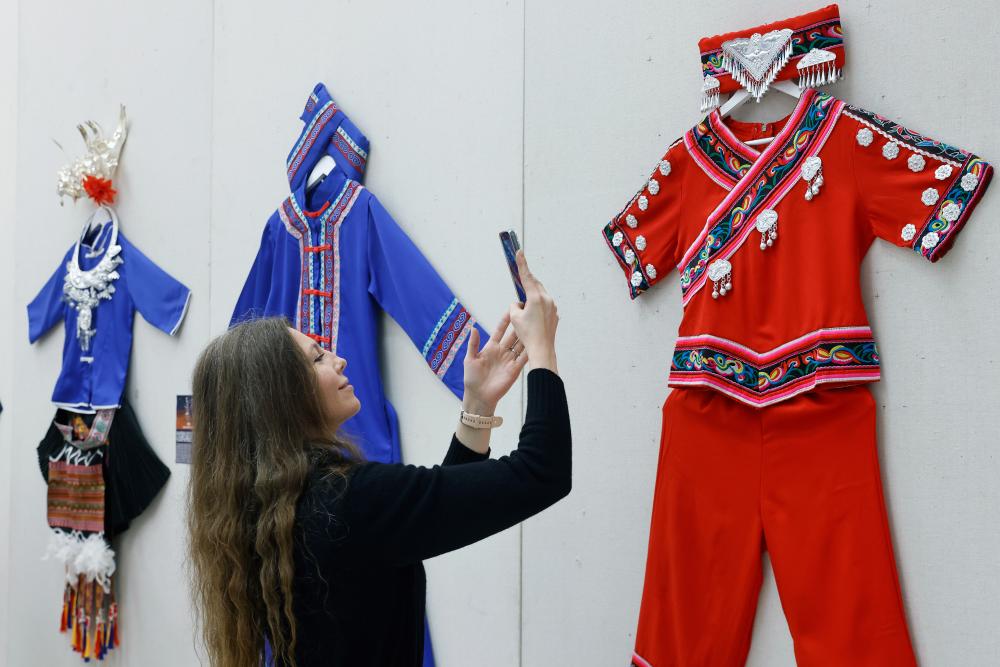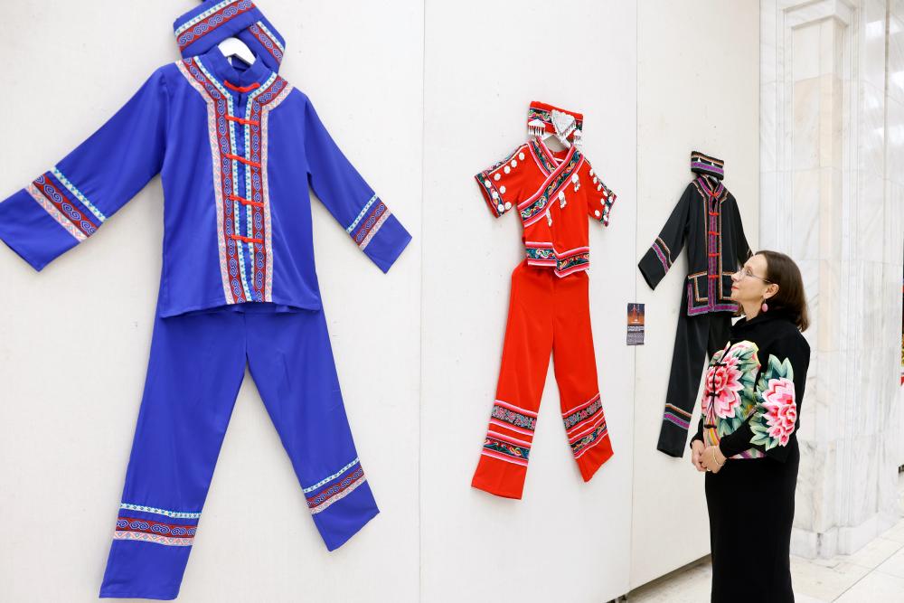 11月11日,在罗马尼亚布加勒斯特,观众参观“霓裳锦韵——中国少数民族服饰展”。