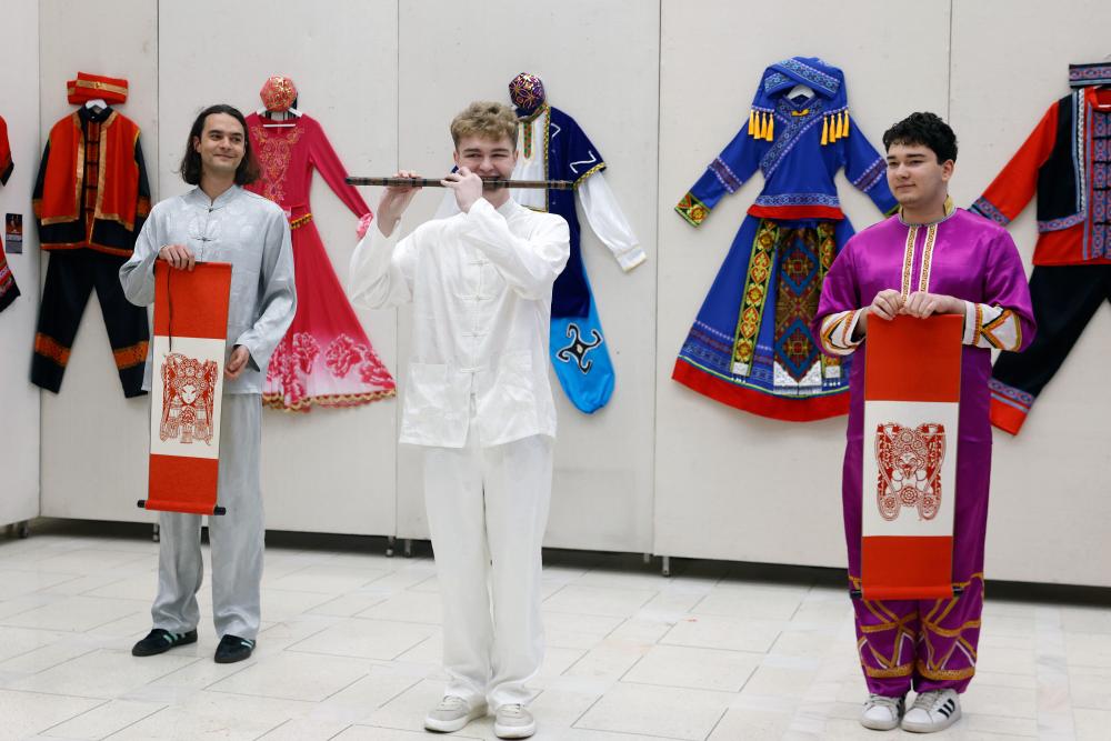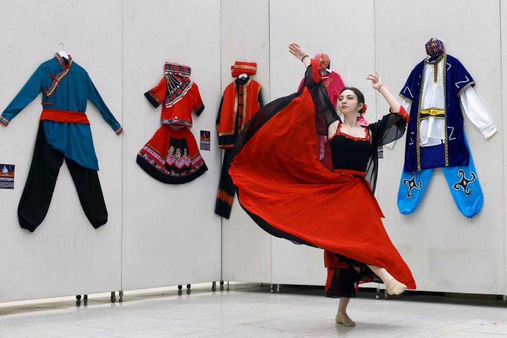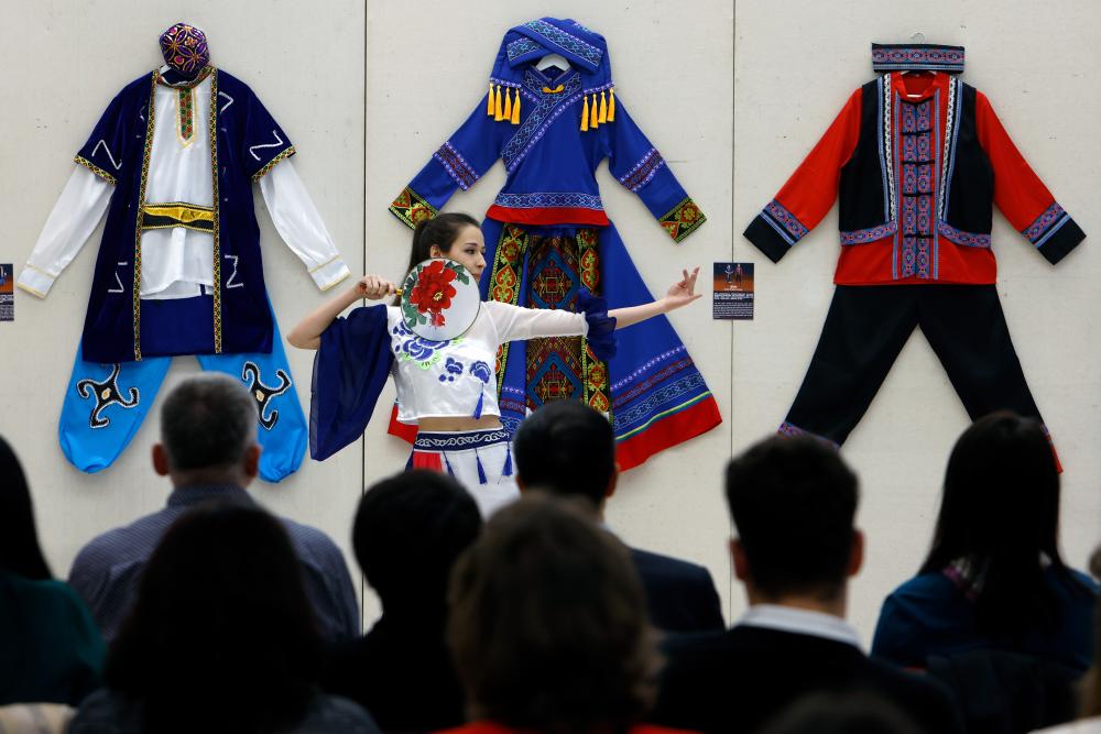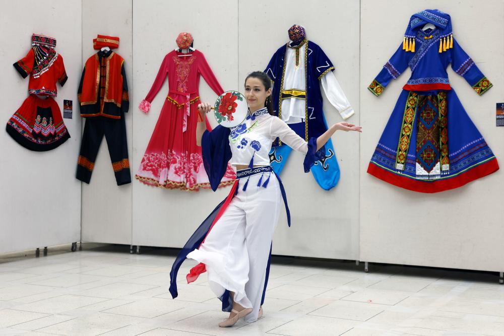 11月11日,在罗马尼亚布加勒斯特,布加勒斯特大学的学生在“霓裳锦韵——中国少数民族服饰展”开幕式上表演。