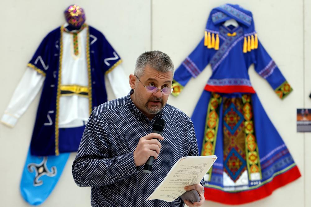 11月11日,在罗马尼亚布加勒斯特,布加勒斯特大学副校长穆古尔·兹洛泰亚在“霓裳锦韵——中国少数民族服饰展”开幕式上致辞。