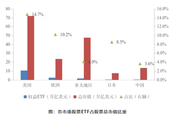 截至2025年底,美国股票ETF规模为10.6万亿美元,美国股票市场总市值为72.1万亿美元,占比为14.7%;欧洲股票ETF规模为2.4万亿美元,欧洲股票市场总市值为23.5万亿美元,占比为10.2%。从亚太地区内部来看,日本股票ETF规模为0.7万亿美元,日本股票市场总市值为7.8万亿美元,占比约8.5%;中国股票ETF规模为0.6万亿美元,占比约3.6%,还有较大发展空间。