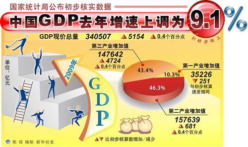 中國GDP去年增速上調為9.1%