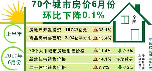 70個城市房價6月份環比下降0.1%