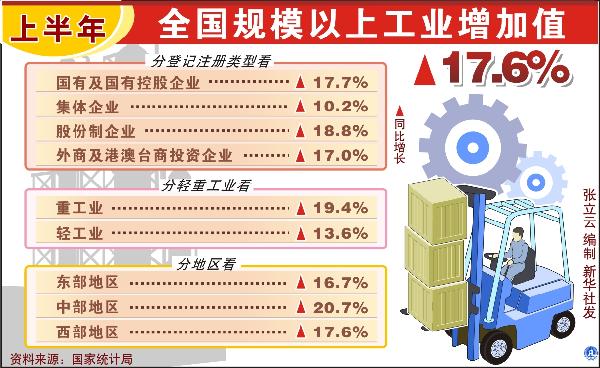 圖表:上半年全國規模以上工業增加值增加17.6%
