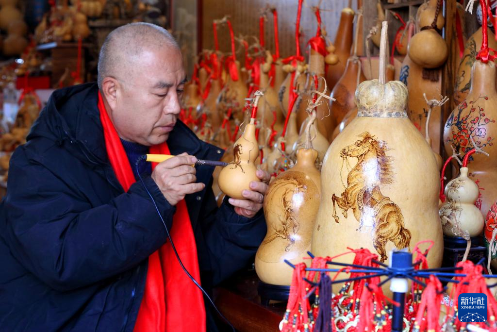 1月17日,在青岛市即墨区,市级非物质文化遗产代表性传承人黄旭在创作马题材的葫芦烙画。