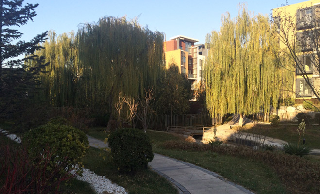 在首開常青藤內部,記者看到不少業主在小區里散步。小區內景觀園林依地勢而建,庭院、水景、花草高低錯落有致,植被茂盛。談到小區的環境,業主表示很滿意。小區內部還建有水景,不過由于時值冬天,記者并沒有看見水流。
