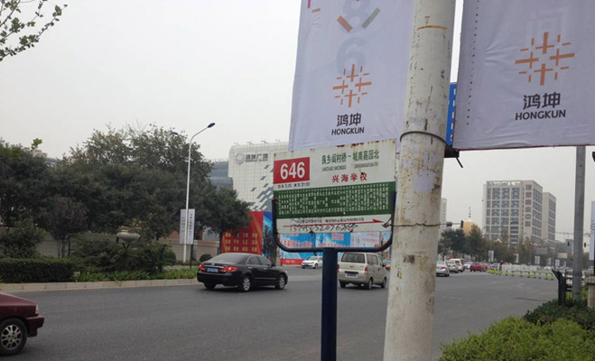 大約走了10分鐘,見到有少量公交車經過,串聯附近小區和商圈。“去小區最好走著或騎自行車,等公共汽車要等挺長時間的。”在公交車站,一位附近小區的居民表示。