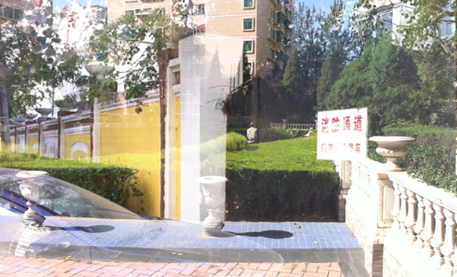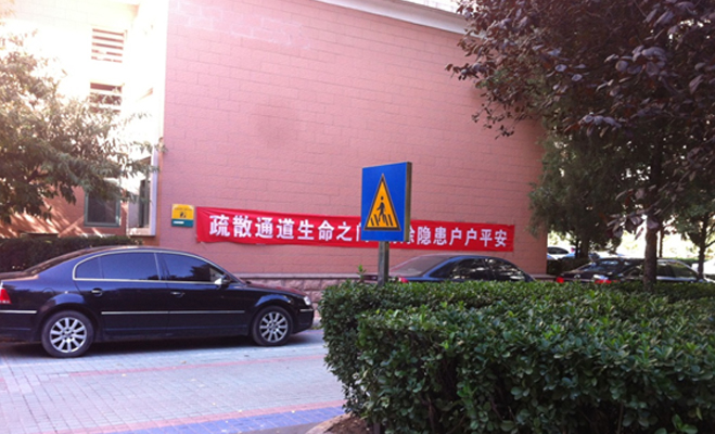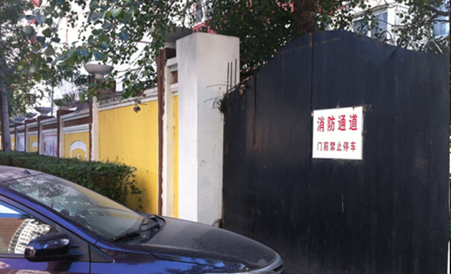 記者跟隨業(yè)主從東門進(jìn)入小區(qū),迎面看到掛有疏散通道的條幅,但疏散通道似乎被車輛占據(jù)。而小區(qū)外面的消防通道門前也寫明了不許停車,但此警告語(yǔ)并沒(méi)有用處,門前依舊停有車輛。小區(qū)東門有保安,業(yè)主需刷卡進(jìn)入,小區(qū)北門有車輛的門禁,但沒(méi)有設(shè)業(yè)主門禁,這與中海其他盤嚴(yán)密的門禁制度不符。