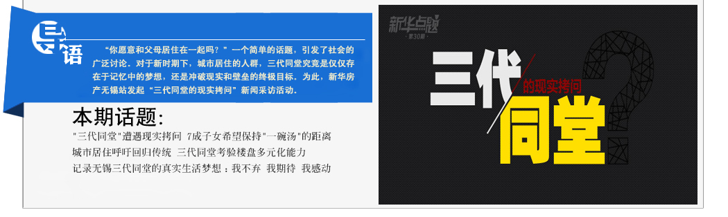對于新時期下,城市居住的人群,三代同堂究竟是僅僅存在于記憶中的夢想,還是沖破現實和壁壘的終極目標。為此,新華房產無錫站發起“三代同堂的現實拷問”新聞采訪活動,走訪蠡園街道12個社區50組家庭,用一個個鮮明的生動故事和生活感悟,詮釋中國式家庭居住方式“三代同堂”的不同看法。