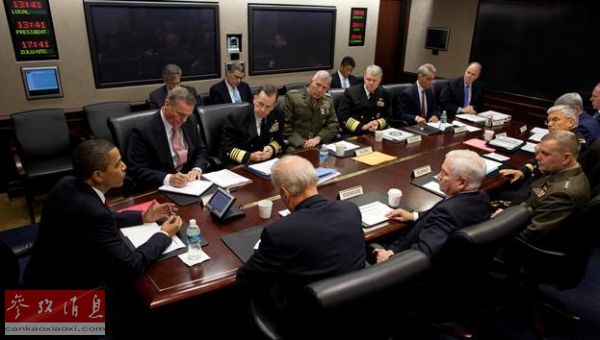 ??? 資料圖:2009年10月,美國(guó)總統(tǒng)奧巴馬在白宮時(shí)局值班室與美軍參謀長(zhǎng)聯(lián)席會(huì)議成員及高級(jí)軍事顧問(wèn)商討阿富汗作戰(zhàn)事宜。