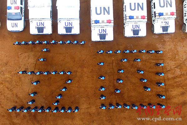 中國第四支駐利比里亞維和警察防暴隊隊員們在營地操場組成“五四”字樣,迎著初升太陽向祖國敬禮。