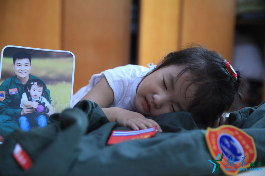 兩歲的女兒輕撫在爸爸的飛行服上,假裝被爸爸溫暖的擁抱所包圍。