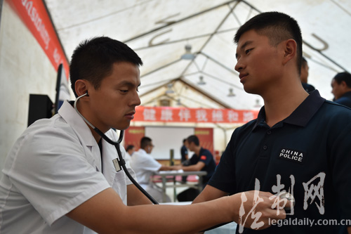 圖為醫護人員使用聽診器對隊員身體進行檢查