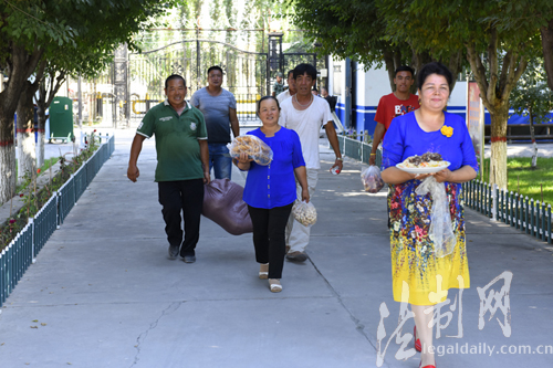 ????“你們平時執勤都那么忙,每次叫你們去我房子吃頓飯都不去,現在總可以嘗一嘗我親手做的馓子了吧”帕提曼手拿著一把馓子遞給了桌旁的民警小王,這是發生在2017年7月26日三道河邊防派出所里的一幕,為了慶祝即將到來的建軍90周年,帕提曼與霍城縣三道河鄉五隊的村民帶著一些自家的東西去慰問邊防派出所的官兵,他們都有一個特殊的身份——新疆邊防總隊伊犁邊防支隊三道河邊防派出所官兵們的結對親戚們。
