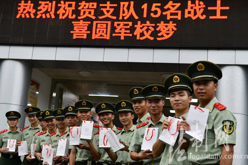 ????昔日禁毒反恐當尖兵,今朝題名金榜站排頭!正當各地紛紛樂道高考升學率的同時,南粵邊防警營也傳來喜報。8月28日,深圳銀湖山訓練基地里處處洋溢著喜悅;禁毒尖兵、狙擊手、士官楊平申等來至廣東公安邊防總隊機動支隊的15名戰士喜圓軍校夢,被廊坊武警學院、公安邊防高等專科學校等3所部隊院校錄取,戰友們為他們舉行簡樸而隆重的歡送儀式。據悉,連續多年來,這個支隊在廣東邊防總隊40多個基層單位中戰士升學率名列前茅。